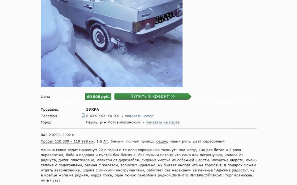 1. Интересно, человек, который размещал это объявление действительно думает, что с таким описанием он автомобиль продаст? Судя по описанию это даже сложно назвать автомобилем. Выгоднее и легче будет ВАЗ-21099 сдать на металлолом, чем пытаться продать. Но если сравнить фотографию и описание, то кажется человек просто что-то тут перепутал.
