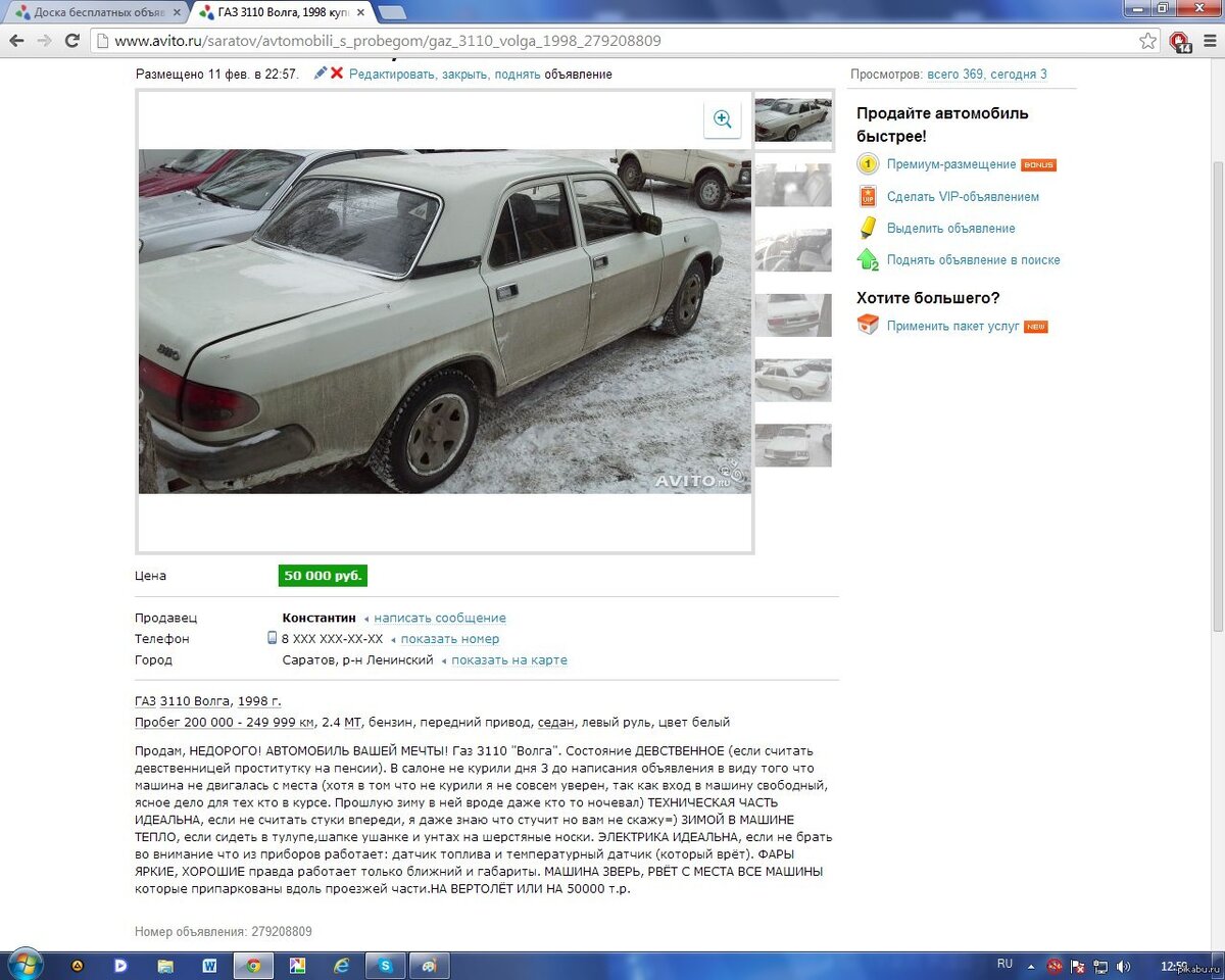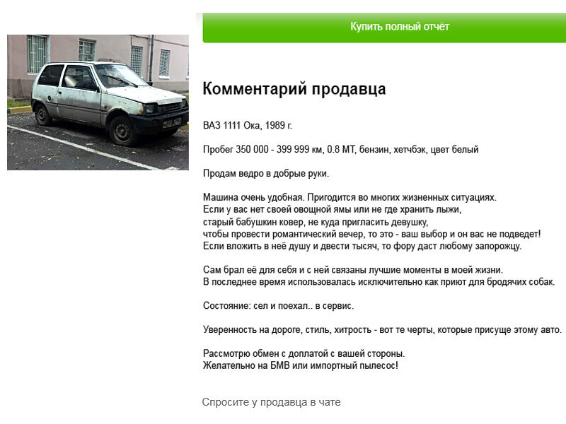 10. Наверняка тут есть какой-нибудь подвох. Но если этот автомобиль такой хороший, то почему владелец его продает? Тут явно что-то не чисто. Но объявление заслуживает внимания, тут описано все что необходимо покупателю знать об автомобиле.